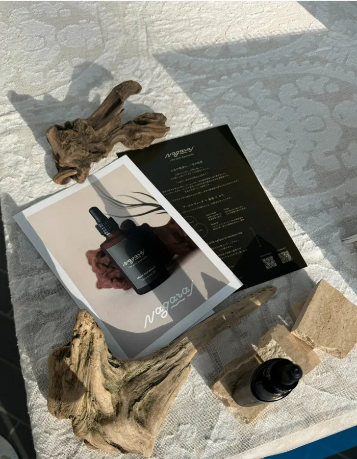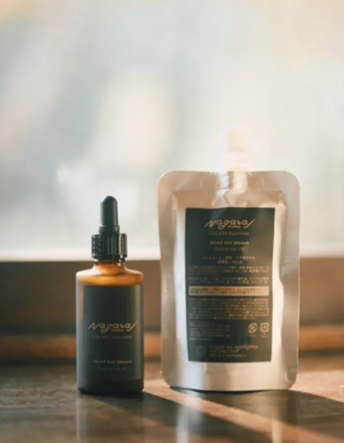 アーユルヴェーダ処方の頭皮ヘアオイルをお願いしております。ナーガラージという化粧品ブランドにて、主にオイル化粧品作ってもらっています。インドの国民的美容法であるヘアオイル習慣は厳選されたハーブで作ったオイルを頭皮とヘアに塗り込み、ヘアパックをして髪を健康に保つ、という習慣で、それを日本で再現できるヘアオイルとなります。より濃厚な成分で頭皮を活性化させる事に特化したスカルプオイルを2番目に作って頂きました。どちらもアーユルヴェーダを基盤に作っております